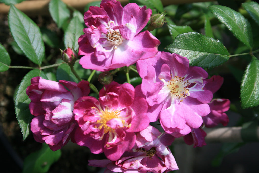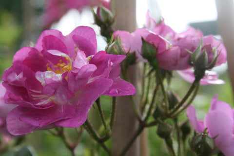 A mauve‑washed shrub rose with delicate dark‑purple blooms fading to lavender, each flower presenting a white center and yellow stamens—a subtle poem in petals. With its spreading habit, it offers a soft, painterly presence in borders or containers, and can even climb if given support. Photos compliments of Kamila Rakowska-szlazkiewicz.